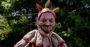 Twisty was dropped on his head as a baby. The physical damage to the brain resulting from such an injury could be a proximate cause of psychopathic behavior and is used in American Horror Story as insight into the chaos exuded by its clownish fiend. Yet when it comes to chaos theory, it’s not just the proximate cause that explains behavior; complex systems (the brain, in this instance) are extremely sensitive to interactions with other complex systems –other people, weather, the ecosystem, cities, climate, living cells and ultimately the entire universe. American Horror Story: Freak Show doesn’t give us all the variables but it does offer some. For one, Twisty was bullied. He was the special children’s clown to Rusty Westchester’s Traveling Carnival. Twisty, always depicted in costume, is the epitome of a clown; escaping his awkwardness by making it an acceptable part of his persona, as children’s entertainer. We’re told that he loved the children and made them laugh but the freaks, jealous of his popularity among his audience, called him “simpleton” and tricked him into believing that the police were after him for child molestation (“Freak Show: Edward Mordrake, Part 2”). Rejected by the townsfolk, who labeled him a pervert and molester, Twisty is forced to flee. So affected is the clown by this interaction with other complex systems that he tries to kill himself but fails, only destroying his face. The only time Twisty is shown without his clown costume is when he attempts suicide; his torment and despair exposed rather than hidden behind the mask. Exuding helpless resignation, Twisty says; “I can’t even kill myself” (“Freak Show: Edward Mordrake, Part 2”). After this failure his clown costume deteriorates and his mobile home is a picture of atrophy, an outward representation of a dilapidated mind. Twisty metes out bloodbath after bloodbath, his acts of violence immortalized in the Jupiter town newspaper: “Farmhouse murder shocks Jupiter,” “hunt for killer heats up,” “Parents murdered, boy missing”.