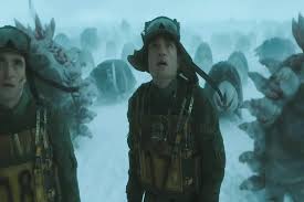 The term “Creepers” is coined by Kenneth Marshall, an egotistical failed politician leading the mission to Nilfheim – more on him later. We first come across the Creepers in the opening scene, when Mickey regains consciousness after having fallen down an ice-crevice. Mickey sees a small group of them at the opposite end of the fissure, and they eventually rush towards him. Mickey thinks they’re going to eat him, but they don’t – they instead collectively carry him out of the fissure to safety. This is something Mickey only realises was deliberate from the Creepers much later in the film, by which point they have been identified by Marshall as enemies that must be exterminated for the success of the colony. They have also been identified by Marshall’s wife Ylfa as a delicacy, and a running sub-plot through the movie is her quest to use the creature’s tails in order to create the perfect dining table condiment.